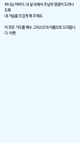 하나님 아버지, 내 삶 속에서 주님의 영광이 드러나 도록 내 가슴을 뜨겁게 해 주세요. 이 모든 기도를 예수 그리스도의 이름으로 드리옵니 다. 아멘.