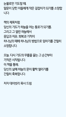 눈물로만 기도할 때, 말문이 닫힌 이들에게 작은 길잡이가 되기를 소망합 니다. 책의 제목처럼 당신의 기도가 하늘을 여는 통로가 되기를, 그리고 그 열린 하늘에서 응답과 치유, 회복과 기적이 하나님의 때에 하나님의 방법으로 임하기를 간절히 소망합니다. 오늘, 다시 기도의 무릎을 꿇는 그 순간부터 기적은 시작됩니다. 이 책을 통해, 당신의 삶에 하늘의 문이 활짝 열리기를 간절히 축복합니다. 저자 데이빗리 목사 드림