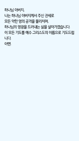 하나님 아버지, 나는 하나님 아버지께서 주신 권세로 모든 악한 영의 공격을 물리치며, 하나님의 영광을 드러내는 삶을 살아가겠습니다. 이 모든 기도를 예수 그리스도의 이름으로 기도드립 니다. 아멘.