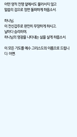 어떤 영적 전쟁 앞에서도 물러서지 않고 말씀의 검으로 정면 돌파하게 하옵소서. 하나님, 이 전신갑주로 완전히 무장하게 하시고, 날마다 승리하며, 하나님의 영광을 나타내는 삶을 살게 하옵소서. 이 모든 기도를 예수 그리스도의 이름으로 드립니 다. 아멘.
