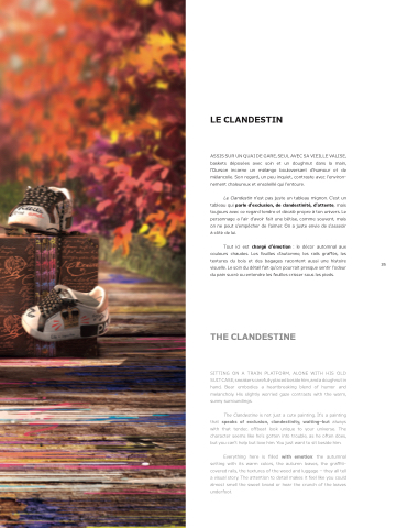ASSIS SUR UN QUAI DE GARE, SEUL AVEC SA VIEILLE VALISE, baskets déposées avec soin et un doughnut dans la main, l’Ourson incarne un mélange bouleversant d’humour et de mélancolie. Son regard, un peu inquiet, contraste avec l’environ- nement chaleureux et ensoleillé qui l’entoure.