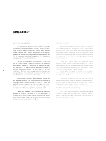 Avec King Street, Stéphane Kristol réaffirme une partie essentielle de son identité artistique : l’urbanité, brute et assumée. Cette sculpture incarne un retour aux sources. Après plusieurs œuvres marquant une transition vers plus de douceur, de ten- dresse et de réflexion intérieure, King Street vient rappeler que l’art de Kristol puise aussi dans l’énergie brute de la rue, dans ce style graphique nerveux, coloré, intense.