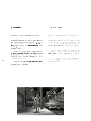 J’ai appelé cette œuvre Le Bad Boy, parce que ce person- nage dégage une assurance, une présence, un charisme naturel. Il avance dans une ambiance qui semble tout droit sortie d’un rêve américain. Certains y verront peut-être Cuba, Miami, Venice Beach... Mais en réalité, ce lieu n’existe pas vraiment : il est né dans l’imagination, dans le souvenir, dans ce que chacun de nous a envie d’y projeter.