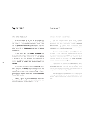 Après Le Voyageur, j’ai eu envie de rester dans cette dynamique urbaine, mais en travaillant un contraste plus subtil. C’est comme ça qu’est née Équilibre. Ce que je voulais, c’était créer une sensation d’apesanteur, une sculpture où le person- nage semble suspendu, presque en flottement — mais tout en restant ancré dans un environnement très brut, très rural et urbain à la fois.
