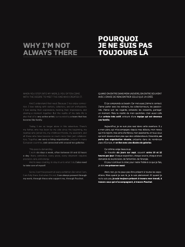 And I understand that need. Because I too enjoy connec- tion. I love talking with visitors, collectors, and art enthusiasts. I love seeing their expressions, hearing their impressions, and sharing a moment together. But the reality of my daily life is also that of a very active artist, surrounded by a team that has become like family.