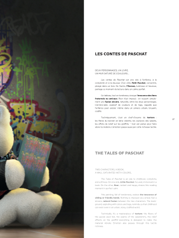 Les contes de Paschat est une ode à l’enfance, à la complicité et à la douceur. D’un côté, Petit Paschat, concentré, plongé dans un livre. De l’autre, l’Ourson, lumineux et heureux, partage ce moment de lecture dans un calme parfait.