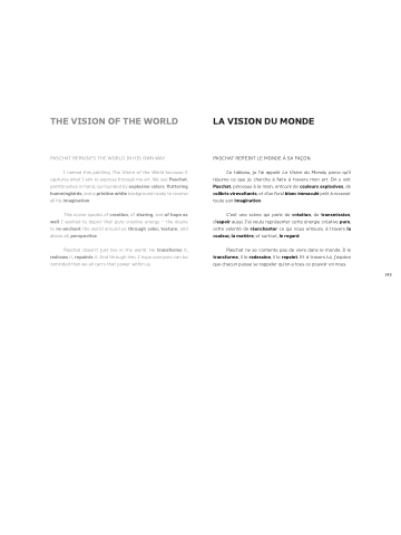 Ce tableau, je l’ai appelé La Vision du Monde, parce qu’il résume ce que je cherche à faire à travers mon art. On y voit Paschat, pinceaux à la main, entouré de couleurs explosives, de colibris virevoltants, et d’un fond blanc immaculé prêt à recevoir toute son imagination.