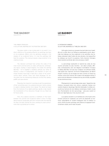 The character portrayed here echoes the codes of my most recent pictorial works: an urban, self-assured, contempo- rary figure, exuding a casual elegance. He evokes the painting Bad Boy — not to highlight a rebellious attitude, but rather to express a sense of independence and freedom of spirit. He moves forward, travel bag in hand, like a citizen of the world— curious about cultures, colors, and visual languages. He car- ries within him the intersecting influences of street life, fashion, graffiti, and raw emotion.