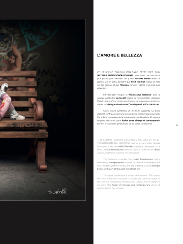 L’arrière-plan évoque la Renaissance italienne, avec la reprise subtile d’un putto ailé, inspiré de l’iconographie classique. Mais ici, les graffitis modernes viennent se superposer à l’ancien, créant un dialogue visuel entre l’art du passé et l’art de la rue.