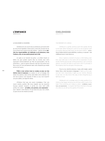 L’Enfance est une œuvre douce, lumineuse, qui touche droit au cœur. En la regardant, chacun peut y retrouver une part de soi. Car au fond, nous restons tous des enfants — parfois cachés der- rière les responsabilités, les habitudes ou les blessures, mais l’enfance, elle, ne nous quitte jamais tout à fait.