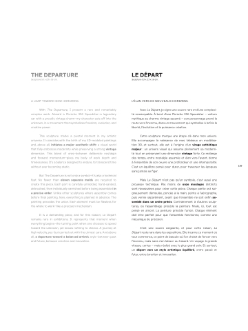 Mais Le Départ n’est pas qu’un symbole, c’est aussi une prouesse technique. Pas moins de onze moulages distincts sont nécessaires pour créer cette pièce. Chaque partie est soi- gneusement démoulée, poncée à la main, peinte à l’aérographe, puis vernie séparément, avant que l’ensemble ne soit enfin as- semblé dans un ordre précis. Contrairement à d’autres sculp- tures, où l’assemblage précède la peinture finale, ici, tout est pensé en amont. La peinture précède l’union. Chaque élément doit être parfait pour que l’ensemble fonctionne, comme une mécanique de précision.