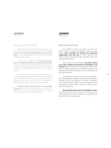 This sculpture is a statement. A vision turned toward the future, imbued with positivity, kindness, and tenderness. Avenir is the meeting of two ages, two timelines, united in the same forward-moving momentum. I project into it my ambitions, my desire to help build a better, fairer world—one where we rise together.