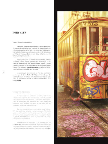 Mais ce qui touche, ici, ce n’est pas seulement la richesse graphique. C’est la relation entre les deux personnages. Le re- gard de l’enfant tourné vers l’adulte, confiant, paisible. Celui de l’adulte, protecteur, prêt à guider. New City fait écho à la sculpture Avenir : c’est une vision positive, humaniste, où l’adulte et l’enfant marchent ensemble vers un futur lumineux.