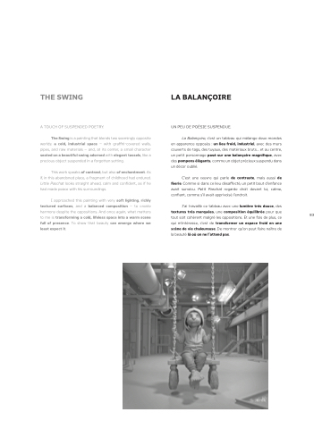 La Balançoire, c’est un tableau qui mélange deux mondes en apparence opposés : un lieu froid, industriel, avec des murs couverts de tags, des tuyaux, des matériaux bruts... et au centre, un petit personnage posé sur une balançoire magnifique, avec des pompons élégants, comme un objet précieux suspendu dans un décor oublié.