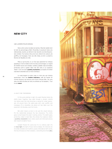 In this scene bathed in light, the adult Paschat holds the child’s hand. Together, they walk through a vibrant, colorful city—where even the tram becomes a canvas for urban expres- sion. All around them, the walls pulse with color, graffiti, and messages. It’s a dreamlike city, where art has taken over the pavement, the facades, even the tracks.