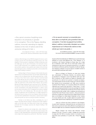 Classé au Patrimoine Mondial de l’UNESCO avec le centre historique d’Avignon et le pont Saint-Bénezet (dit « Pont d’Avignon »), ce monument, chef d’œuvre Gothique du Moyen Age, fut le siège de la chrétienté au XIVe siècle. De sa construction initiale à son achèvement tel que nous le connaissons aujourd’hui, il a vu défiler les meilleurs architectes, peintres, fresquistes, érudits de l’époque, tous disposés à sublimer ce qui est toujours considéré comme le plus grand édifice gothique ayant existé.