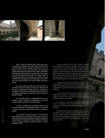 Outre la création de la partie dite du palais neuf, celui-ci fini de détruire les quelques restes des travaux de Jean XXII, dont sa salle d’audience située à l’époque en plein cœur de ce qui est devenu la cour d’honneur. Sur le Palais Vieux, de somptueuses fresques effectuées par des élèves de l’Ecole Italienne, dont Simone Martini et Matteo Giovanetti, vinrent recouvrir les murs et un blason aux armes des Roger, famille dont était issu le pape, finaliser la merveilleuse façade de la porte Champeaux. Ces armes « d’argent à la bande d’azur accompagné de six roses de gueules, trois en chef en orle, trois en pointe de bande » sont toujours visibles au dessus de la porte.