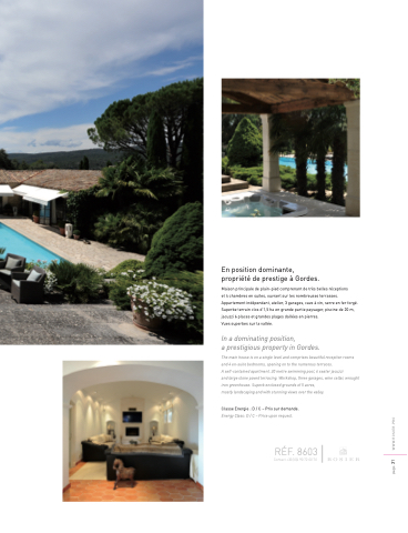 et 4 chambres en suites, ouvrant sur les nombreuses terrasses. Appartement indépendant, atelier, 3 garages, cave à vin, serre en fer forgé. Superbe terrain clos d’1,5 ha en grande partie paysager, piscine de 20 m, jacuzzi 6 places et grandes plages dallées en pierres.