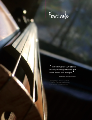 Festivals “ Tout est musique ; un tableau, un livre, un voyage ne valent que si l’on entend leur musique. ” JACQUES DE BOURBON-BUSSET “Everything is music; a picture, a book or a journey are worthless if you cannot hear their music.”