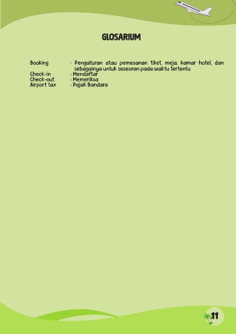 GLOSARIUM Booking : Pengaturan atau pemesanan tiket, meja, kamar hotel, dan sebagainya untuk seseoran pada waktu tertentu Check-in : Mendaftar Check-out : Memeriksa Airport tax : Pajak Bandara 11