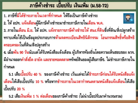 5.1 เสียเบี้ยปรับ 40 % ของภาษค้างชาระ เว้นแตจะได้ชาระภาษก่อนได้รับหนังสือแจ้ง