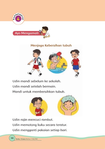Menjaga Kebersihan tubuh Udin mandi sebelum ke sekolah. Udin mandi setelah bermain. Mandi untuk membersihkan tubuh. Udin rajin mencuci rambut. Udin memotong kuku secara teratur. Udin mengganti pakaian setiap hari. 98 Buku Siswa Kelas 1 SD/MI