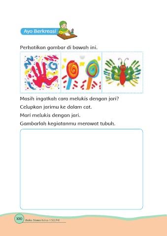 Perhatikan gambar di bawah ini. Masih ingatkah cara melukis dengan jari? Celupkan jarimu ke dalam cat. Mari melukis dengan jari. Gambarlah kegiatanmu merawat tubuh. 100 Buku Siswa Kelas 1 SD/MI