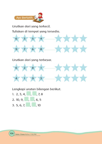 Urutkan dari yang terkecil. Tuliskan di tempat yang tersedia. 6 3 5 4 9 7 6 8 Urutkan dari yang terbesar. 6 2 8 1 4 1 9 3 Lengkapi urutan bilangan berikut. 1. 2, 3, 4, , , 7, 8 2. 10, 9, , , 6, 5 3. 5, 6, 7, , , 10 106 Buku Siswa Kelas 1 SD/MI