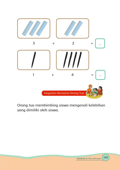 3 + 2 = ... 1 + 4 = ... Orang tua membimbing siswa mengenali kelebihan yang dimiliki oleh siswa. 139 Subtema 4: Aku Istimewa
