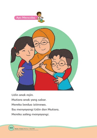 Udin anak rajin. Mutiara anak yang sabar. Mereka berdua istimewa. Ibu menyayangi Udin dan Mutiara. Mereka saling menyayangi. 144 Buku Siswa Kelas 1 SD/MI