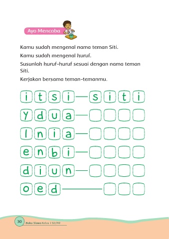 Kamu sudah mengenal nama teman Siti. Kamu sudah mengenal huruf. Susunlah huruf-huruf sesuai dengan nama teman Siti. Kerjakan bersama teman-temanmu. i t s i s i t i y d u a l n i a e n b i d i u n o e d 30 Buku Siswa Kelas 1 SD/MI