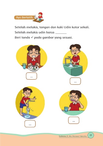 Setelah melukis, tangan dan kaki Udin kotor sekali. Setelah melukis udin harus _______ Beri tanda pada gambar yang sesuai. ... ... ... ... 77 Subtema 3: Aku Merawat Tubuhku