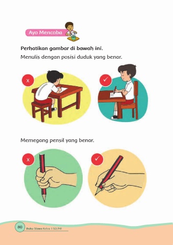 Perhatikan gambar di bawah ini. Menulis dengan posisi duduk yang benar. Memegang pensil yang benar. 80 Buku Siswa Kelas 1 SD/MI
