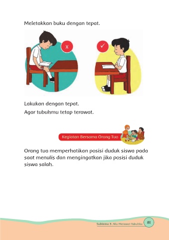 Meletakkan buku dengan tepat. Lakukan dengan tepat. Agar tubuhmu tetap terawat. Orang tua memperhatikan posisi duduk siswa pada saat menulis dan mengingatkan jika posisi duduk siswa salah. 81 Subtema 3: Aku Merawat Tubuhku
