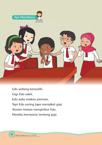 Edo sedang bersedih. Gigi Edo sakit. Edo suka makan permen. Tapi Edo sering lupa menyikat gigi. Teman-teman menghibur Edo. Mereka bernyanyi tentang gigi. 92 Buku Siswa Kelas 1 SD/MI