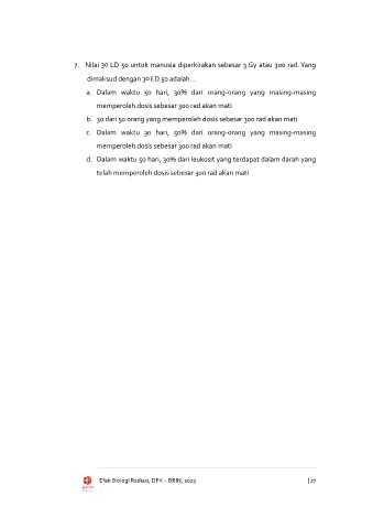 7. Nilai 30 LD 50 untuk manusia diperkirakan sebesar 3 Gy atau 300 rad. Yang