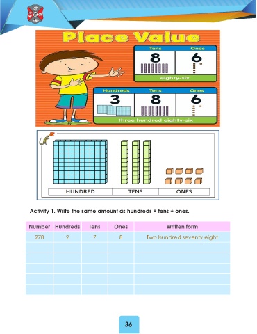 Activity 1. Write the same amount as hundreds + tens + ones. Number Hundreds Tens Ones Written form 278 2 7 8 Two hundred seventy eight 36