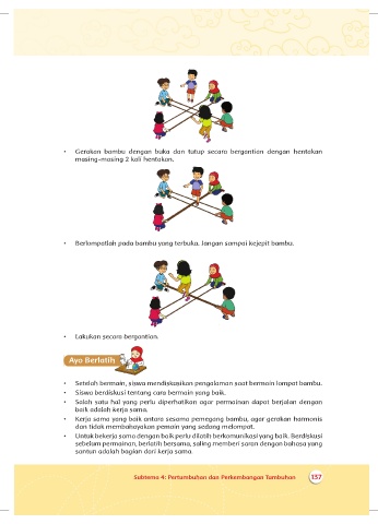 • Setelah bermain, siswa mendiskusikan pengalaman saat bermain lompat bambu.