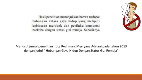 Menurut jurnal penelitian Iftita Rochman, Merryana Adriani pada tahun 2013 dengan judul “ Hubungan Gaya Hidup Dengan Status Gizi Remaja”