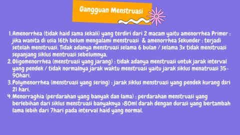 1. Amenorrhea (tidak haid sama sekali) yang terdiri dari 2 macam yaitu amenorrhea Primer :