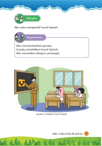 Sikapku Aku suka menghafal huruf hijaiah. Kegiatanku Aku memperhatikan guruku. Guruku melafalkan huruf hijaiah. Aku menirukan dengan semangat. Gambar 1.4 Belajar huruf hijaiah Bab 1 l Aku Cinta Al-Qur’an 7