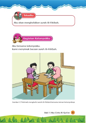 Tekadku Aku akan menghafalkan surah Al-F±ti¥ah. Kegiatan Kelompokku Aku bersama kelompokku. Kami menyimak bacaan surah Al-F±ti¥ah. Gambar 1.7 Fatimah menghafal surah Al-F±ti¥ah bersama teman kelompoknya Bab 1 l Aku Cinta Al-Qur’an 11