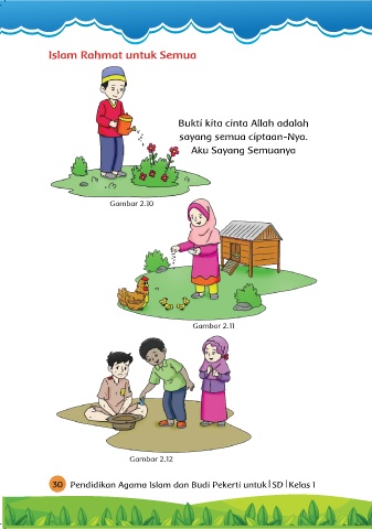 Islam Rahmat untuk Semua Bukti kita cinta Allah adalah sayang semua ciptaan-Nya. Aku Sayang Semuanya Gambar 2.10 Gambar 2.11 Gambar 2.12 30 Pendidikan Agama Islam dan Budi Pekerti untuk SD Kelas I