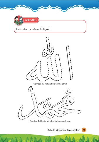 Tekadku Aku suka membuat kaligrafi. Gambar 4.7 Kaligrafi lafaz Allah Swt Gambar 4.8 Kaligrafi lafaz Muhammad saw. Bab 4 l Mengenal Rukun Islam 61