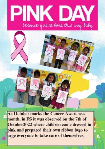As October marks the Cancer Awareness month, in FS it was observed on the 7th of October2022 where children came dressed in pink and prepared their own ribbon logo to urge everyone to take care of themselves.
