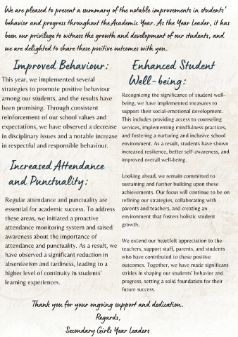 behavior and progress throughout the Academic Year. As the Year Leader, it has