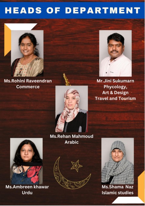 HEADS OF DEPARTMENT Ms.Rohini Raveendran Mr.Jini Sukumarn Commerce Phycology, Art & Design Travel and Tourism Ms.Rehan Mahmoud Arabic Ms.Ambreen khawar Ms.Shama Naz Urdu Islamic studies