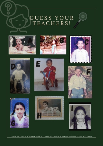 G U E S S Y O U R T E A C H E R S ! A B C D E F I H G Answers: A - Mr. Shinto, B - Ms. Rakhy, C - Mr. Parvez, D - Ms. Nisha, E - Ms. Navami, F - Mr. Elbin, G - Ms. Rohini, H - Ms. Helen, I - Ms. Jayanthi