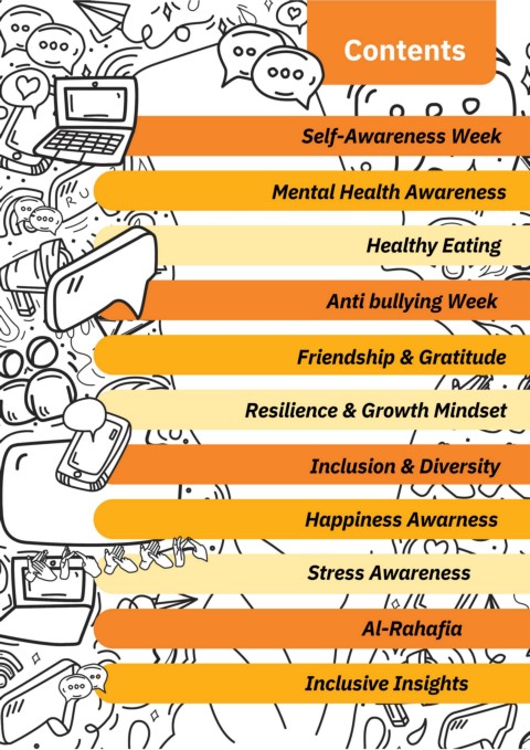 Contents Self-Awareness Week Mental Health Awareness Healthy Eating Anti bullying Week Friendship & Gratitude Resilience & Growth Mindset Inclusion & Diversity Happiness Awarness Stress Awareness Al-Rahafia Inclusive Insights