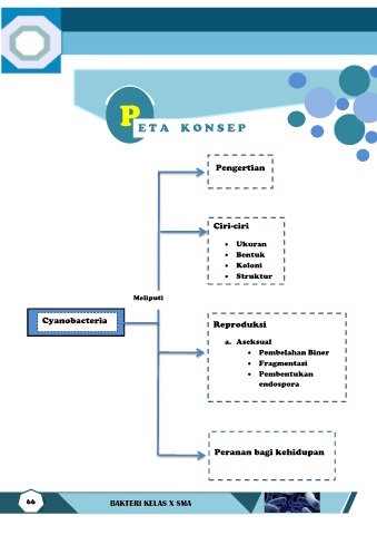 P E T A K O N S E P Pengertian Ciri-ciri Ukuran Bentuk Koloni Struktur Meliputi Cyanobacteria Reproduksi a. Aseksual Pembelahan Biner Fragmentasi Pembentukan endospora Peranan bagi kehidupan 66 BAKTERI KELAS X SMA c